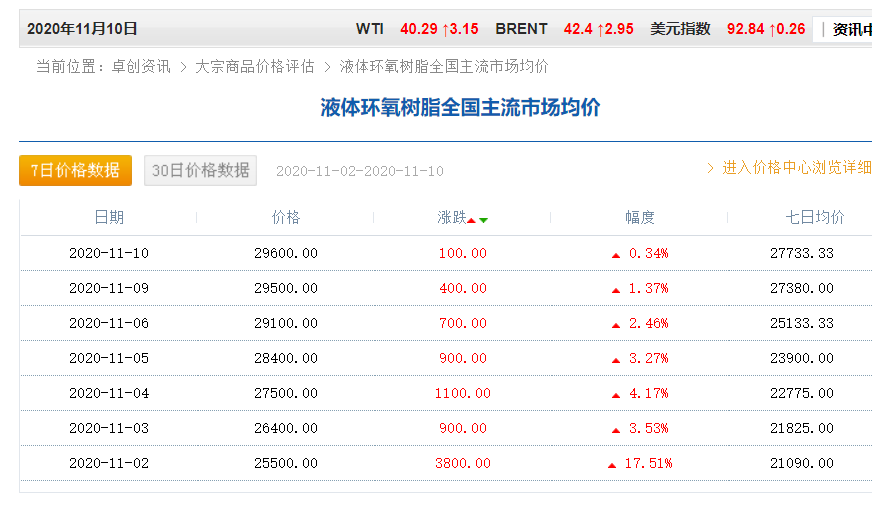 卓創(chuàng)資訊數(shù)據(jù)顯示,液體環(huán)氧樹脂全國主流市場均價,從11月2日至11月10日,連續(xù)7個交易日上漲,其間11月2日單日上漲3800元/噸,目前已漲至29600元/噸。