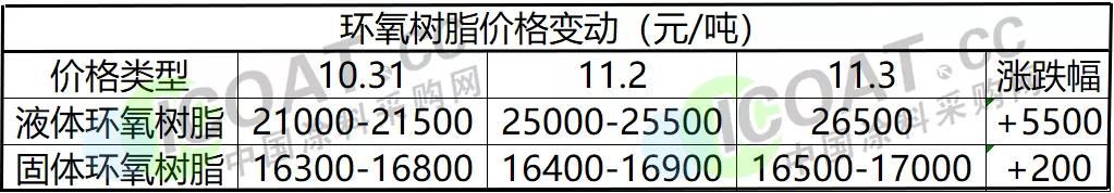 11月2日,環(huán)氧樹脂價格大漲,一舉突破25000元/噸,日暴漲4000元/噸,11月3日,環(huán)氧樹脂價格繼續(xù)上漲,最高日漲1500元/噸。一周之內(nèi)累計漲超5500元/噸,廠家大多封盤觀望為主。