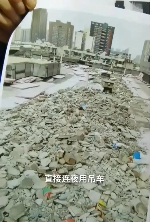據(jù)該小區(qū)的業(yè)主拍下照片爆料稱:我們小區(qū)是去年11月份,開始進(jìn)行老小區(qū)改造的,改造小區(qū)樓頂做樓層防水的時(shí)候,該小區(qū)的物業(yè)經(jīng)理為了節(jié)省費(fèi)用,指使施工方把剝離下來的墻面建筑垃圾,以及部分的生活垃圾,直接連夜用吊車全部運(yùn)到樓頂。運(yùn)到樓頂以后先做掩埋,然后再在垃圾上面再去做防水,建筑垃圾和生活垃圾,主要集中在22號樓,剩余的光建筑垃圾每個(gè)樓都有。這些建筑垃圾用了一個(gè)禮拜的時(shí)間,吊到了22號樓上面。