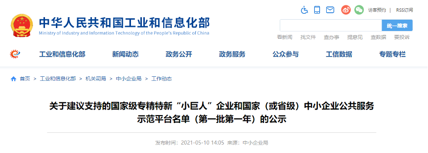 5月10日,工信部網(wǎng)站發(fā)布,根據(jù)《財政部 工業(yè)和信息化部關(guān)于支持“專精特新”中小企業(yè)高質(zhì)量發(fā)展的通知》,公示了第一批第一年“建議支持的國家級專精特新‘小巨人’企業(yè)名單“和“國家(或省級)中小企業(yè)公共服務(wù)示范平臺名單”。