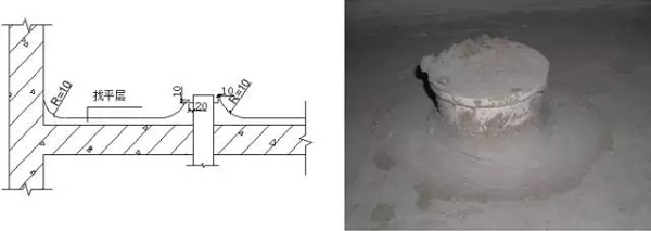 ? ? 管根及墻角處抹圓弧,半徑10mm。管根與找平層之間應(yīng)留出20mm寬、10mm深凹槽。
