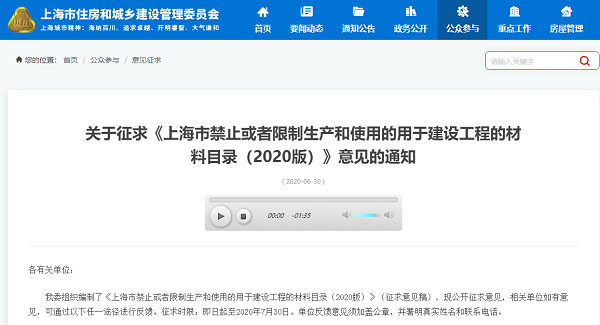 6月30日,上海市住房和城鄉(xiāng)建設(shè)管理委員會(huì)發(fā)布關(guān)于征求《上海市禁止或者限制生產(chǎn)和使用的用于建設(shè)工程的材料目錄(2020版)》意見(jiàn)的通知。通知顯示,上海市住建委對(duì)外墻保溫系統(tǒng)、建筑幕墻、建設(shè)用砂、外窗及五金配件、防水材料和涂料六種類別21種建設(shè)工程用材料進(jìn)行禁止或者限制生產(chǎn)和使用的征求。征求時(shí)限從2020年6月30日起至2020年7月30日。