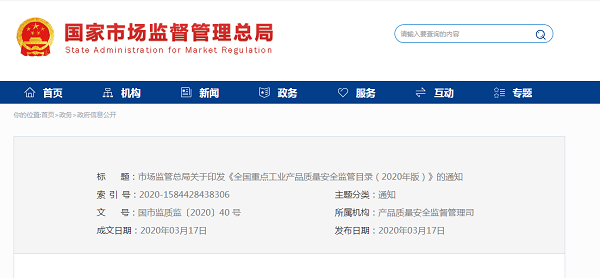 3月17日,國(guó)家市場(chǎng)監(jiān)管總局印發(fā)《全國(guó)重點(diǎn)工業(yè)產(chǎn)品質(zhì)量安全監(jiān)管目錄(2020年版)》(簡(jiǎn)稱(chēng):《目錄》),《目錄》涉及文教體育用品、家用電器及電器附件、電子及信息技術(shù)產(chǎn)品、老年人用品、兒童用品、家具及建筑裝飾裝修材料、服裝鞋帽及家用紡織品、日用化學(xué)制品及衛(wèi)生用品、交通用具及相關(guān)產(chǎn)品、食品相關(guān)產(chǎn)品、日用雜品、工業(yè)生產(chǎn)資料、農(nóng)業(yè)生產(chǎn)資料等類(lèi)別的269種產(chǎn)品。